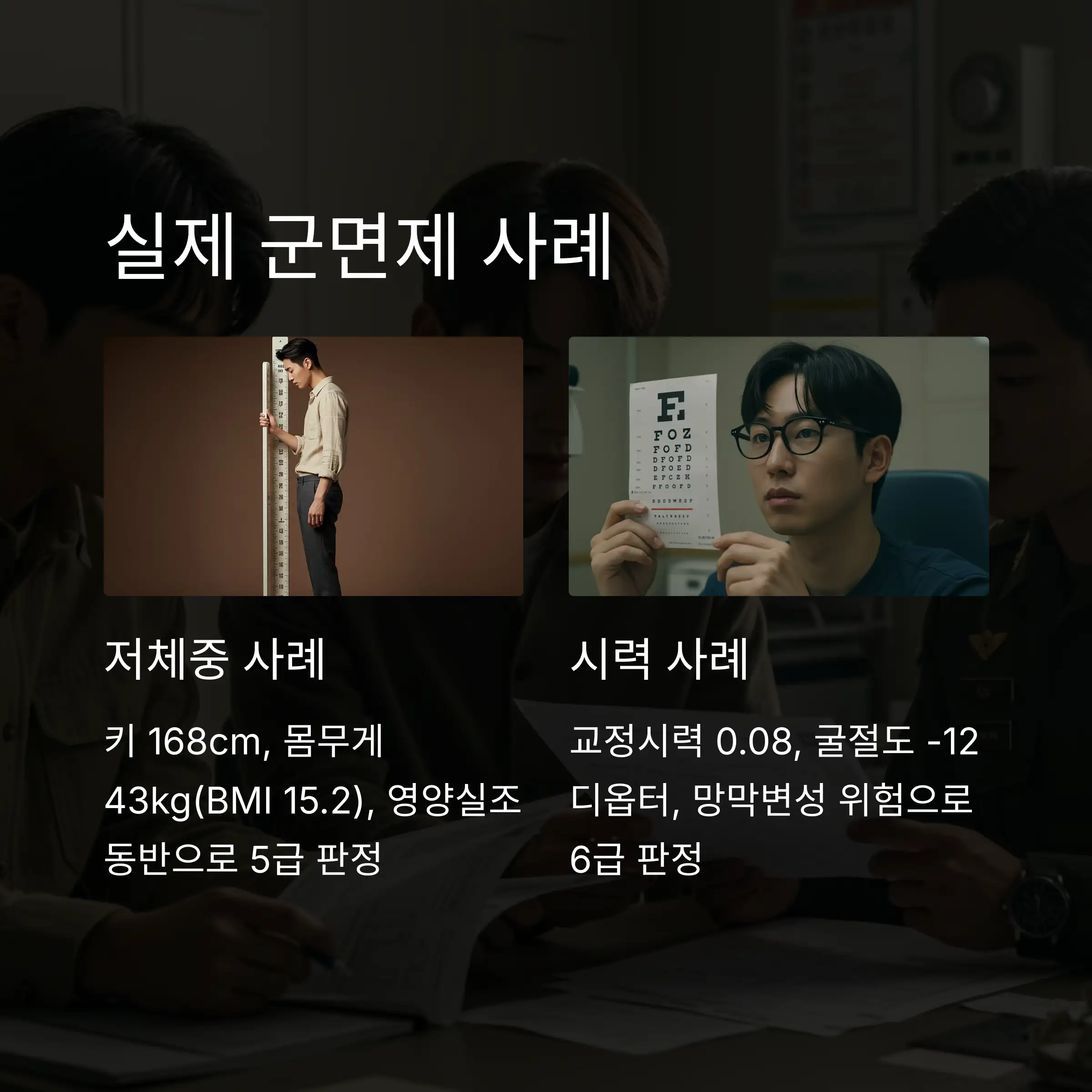 실제로 군면제를 받은 사례들을 살펴보면 더 이해가 쉬울 거예요. A씨는 키 168cm에 몸무게 43kg으로 BMI가 15.2였어요. 저체중으로 인한 건강 문제가 확인되어 5급 전시근로역 판정을 받았답니다. 단순히 마른 것이 아니라 영양실조와 관련된 건강 문제가 있었기 때문이에요.