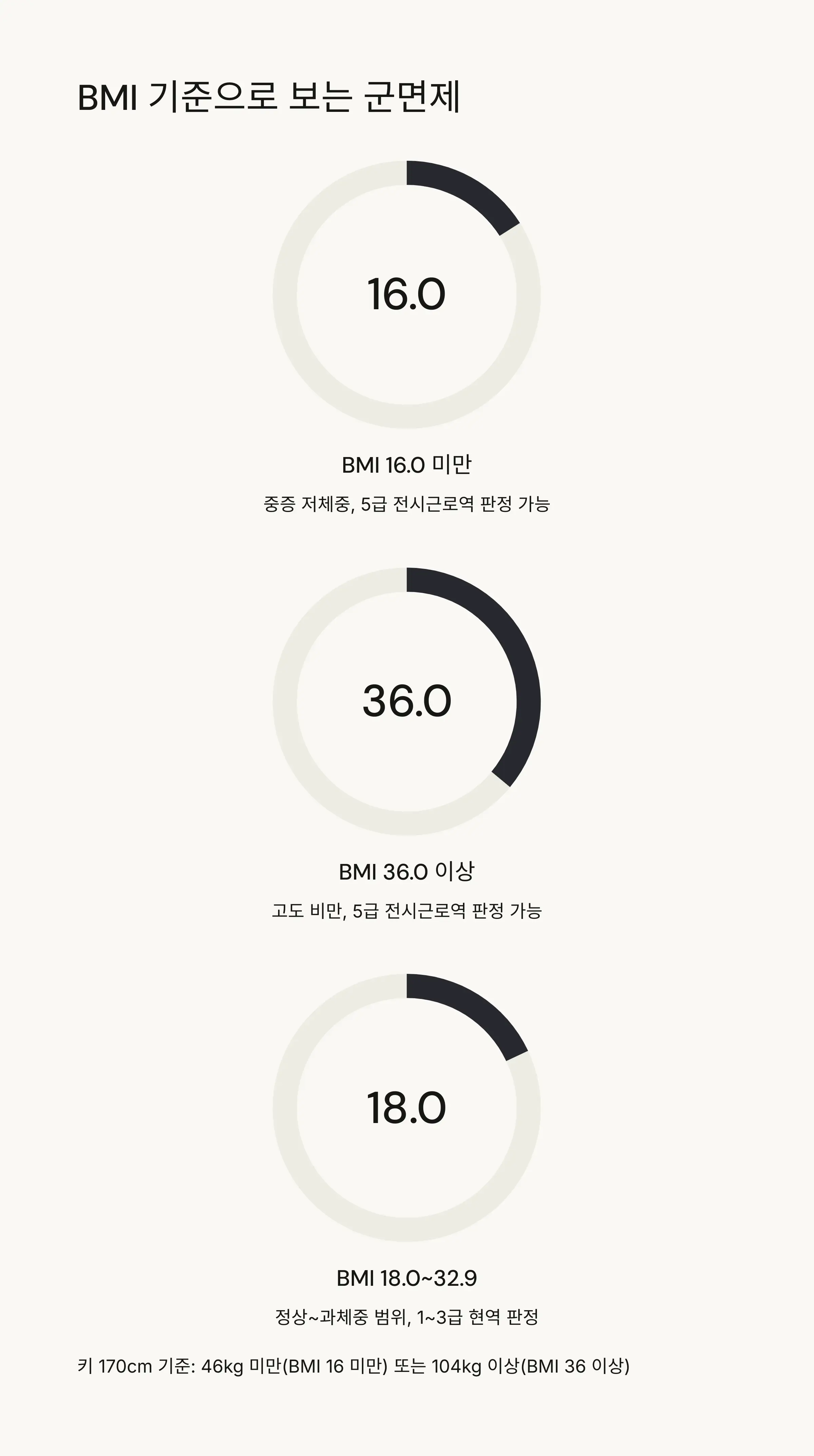 키와 몸무게는 개별적으로 평가되는 것이 아니라 BMI(체질량지수)로 환산되어 평가돼요. BMI는 체중(kg)을 키(m)의 제곱으로 나눈 값인데, 이 수치가 너무 낮거나 높으면 군 복무가 어렵다고 판단하게 됩니다. 2025년 현재 기준으로 BMI 16.0 미만이면 5급, 36.0 이상이면 역시 5급 판정을 받을 수 있어요.