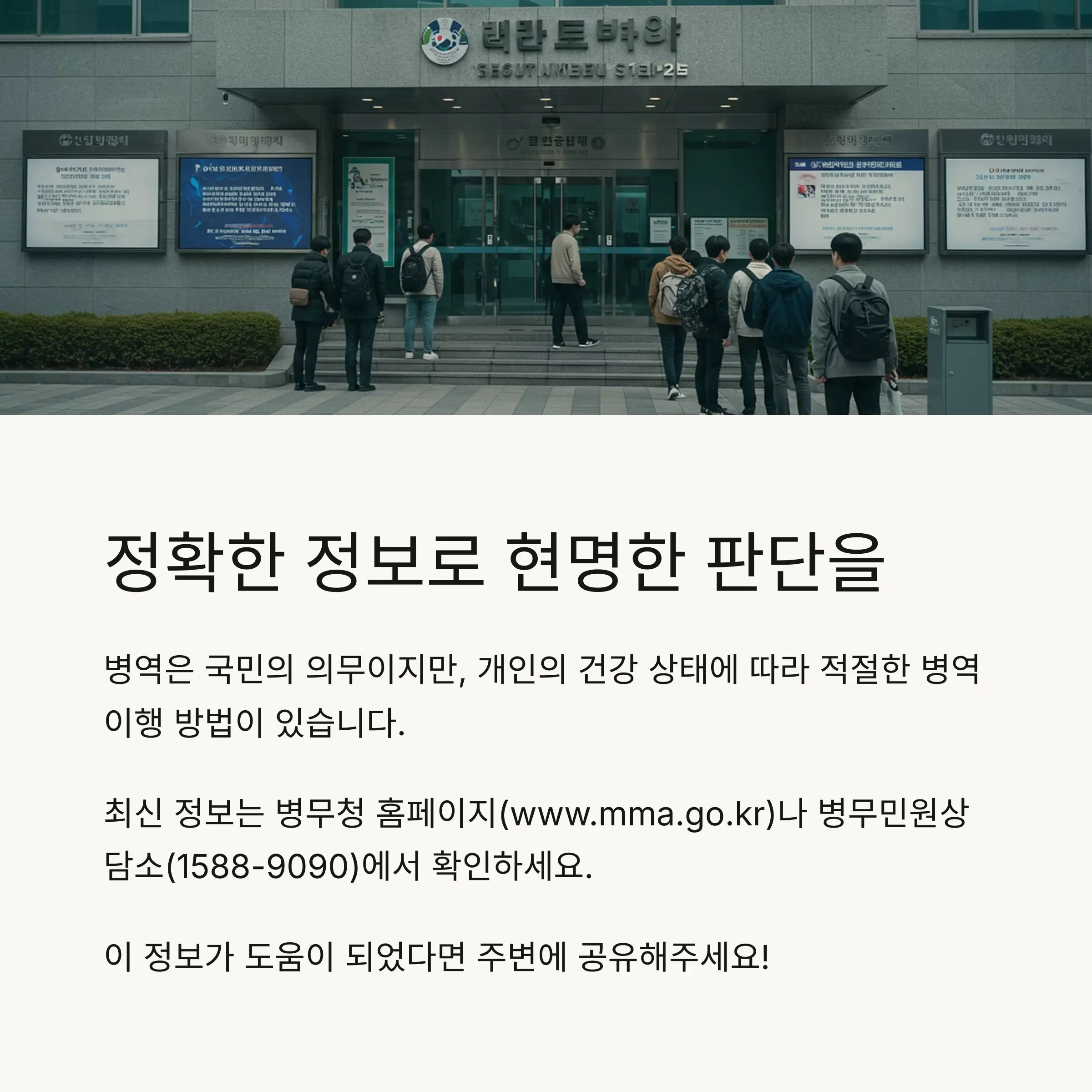 본 정보는 2025년 1월 기준으로 작성되었으며, 병역법 개정에 따라 내용이 변경될 수 있습니다. 정확한 정보는 병무청 홈페이지(www.mma.go.kr) 또는 병무민원상담소(1588-9090)에서 확인하시기 바랍니다. 병역은 국민의 신성한 의무이며, 정직하고 성실하게 임하는 것이 중요합니다.