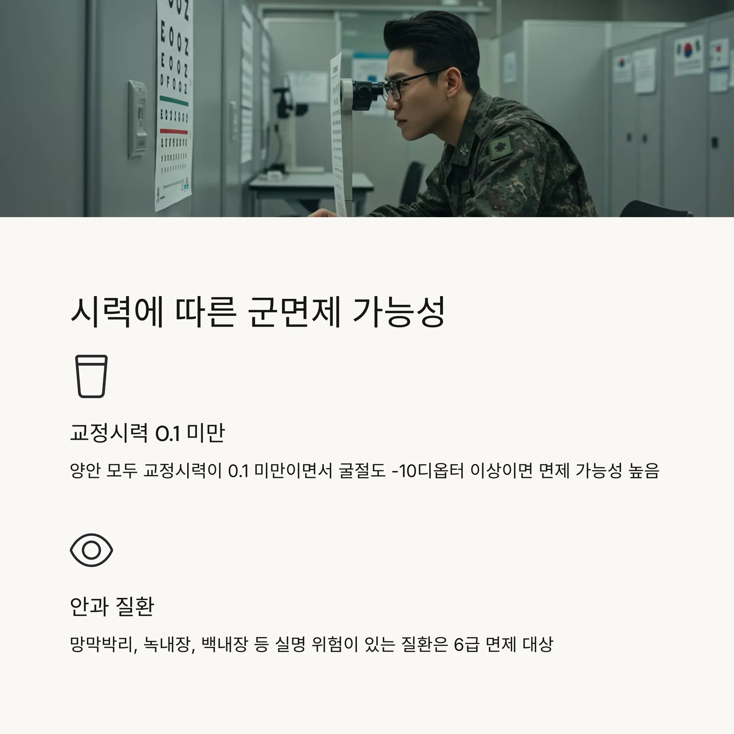 시력은 병역 판정에서 중요한 요소 중 하나예요. 많은 분들이 "시력이 나쁘면 군대 안 가도 되나요?"라고 물어보시는데, 단순히 시력이 나쁘다고 해서 무조건 면제되는 것은 아니에요. 병무청에서는 '교정시력'을 기준으로 판정하기 때문에, 안경이나 렌즈를 착용했을 때의 시력이 중요해요.