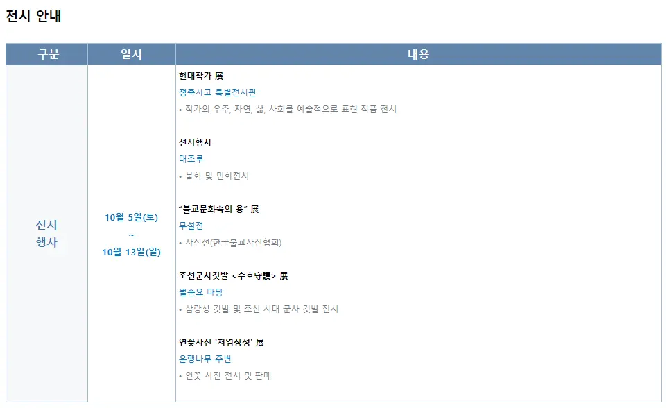 | 전시 | 현대작가전, 조선군사 깃발 전시, 불교문화 속의 용 사진전 |