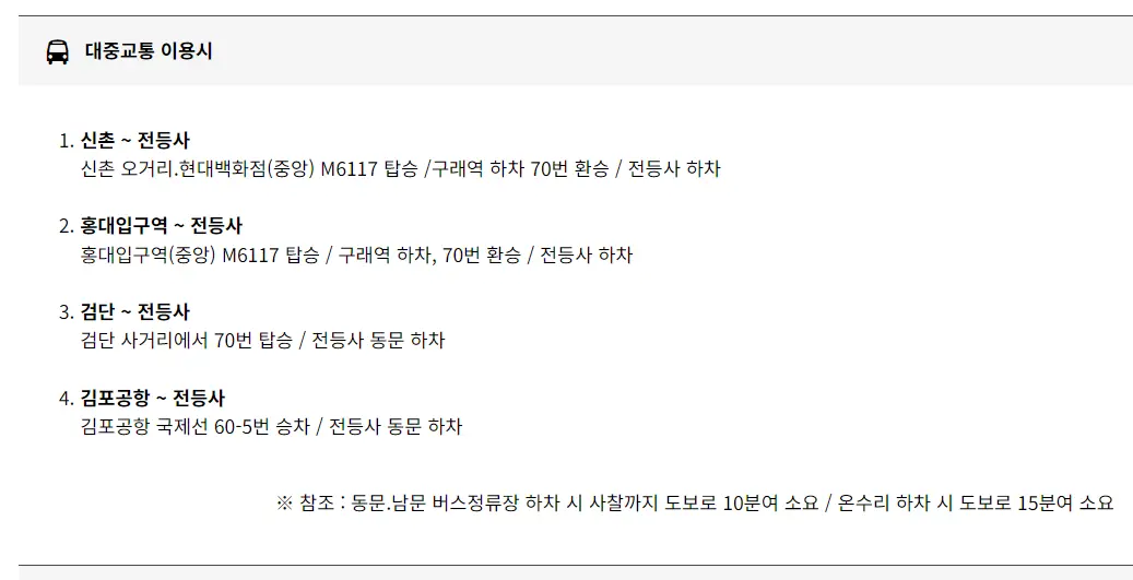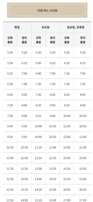대중교통을 이용하는 방법도 추천드립니다. (아래 70번, 60-5번 버스 시간표 참고)