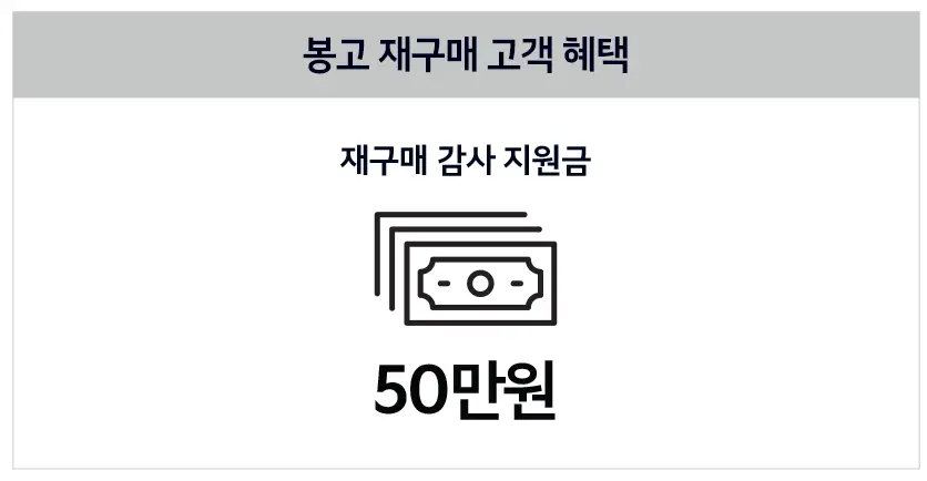 또한 봉고 차량을 재구매하는 고객을 위해 50만 원의 재구매 지원금을 제공합니다.