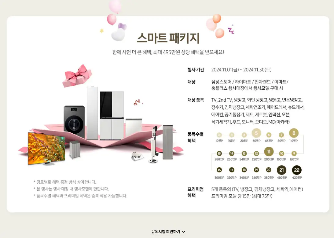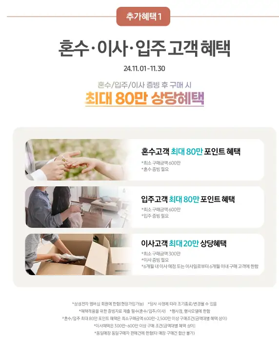 신혼부부 및 이사 고객을 위한 맞춤 패키지 구매 시 최대 690만 원 상당의 포인트와 캐시백 혜택이 적용됩니다. 이 패키지는 주로 TV, 냉장고, 세탁기 등 필수 가전제품을 포함해 구매자들에게 실질적인 혜택이 될것으로 생각됩니다.
