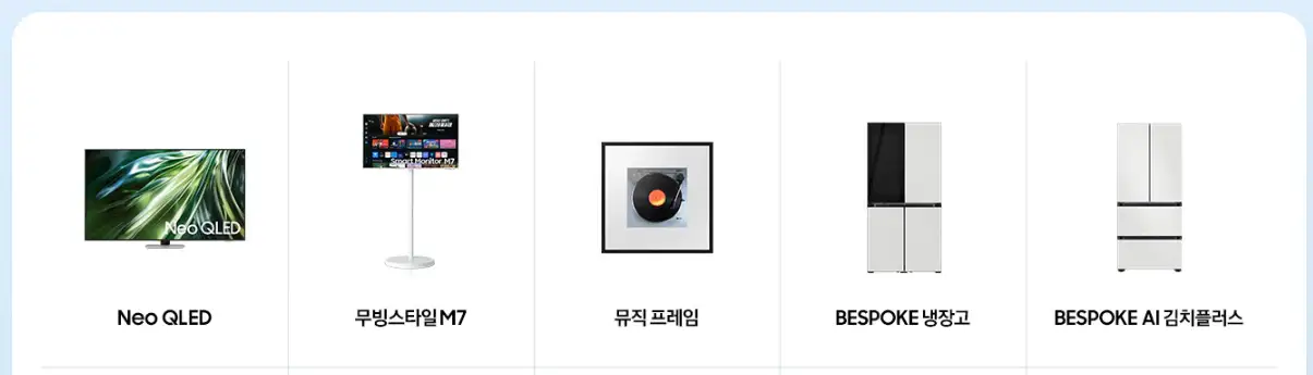 이 제품은 스포츠 경기나 영화 감상 시 생동감 있는 화면을 제공해 많은 가정에서 선호됩니다. - BESPOKE 냉장고: 모듈형 디자인으로 주방에 맞춤형 인테리어 효과를 줄 수 있는 BESPOKE 냉장고도 최대 30% 할인된 가격으로 제공됩니다.