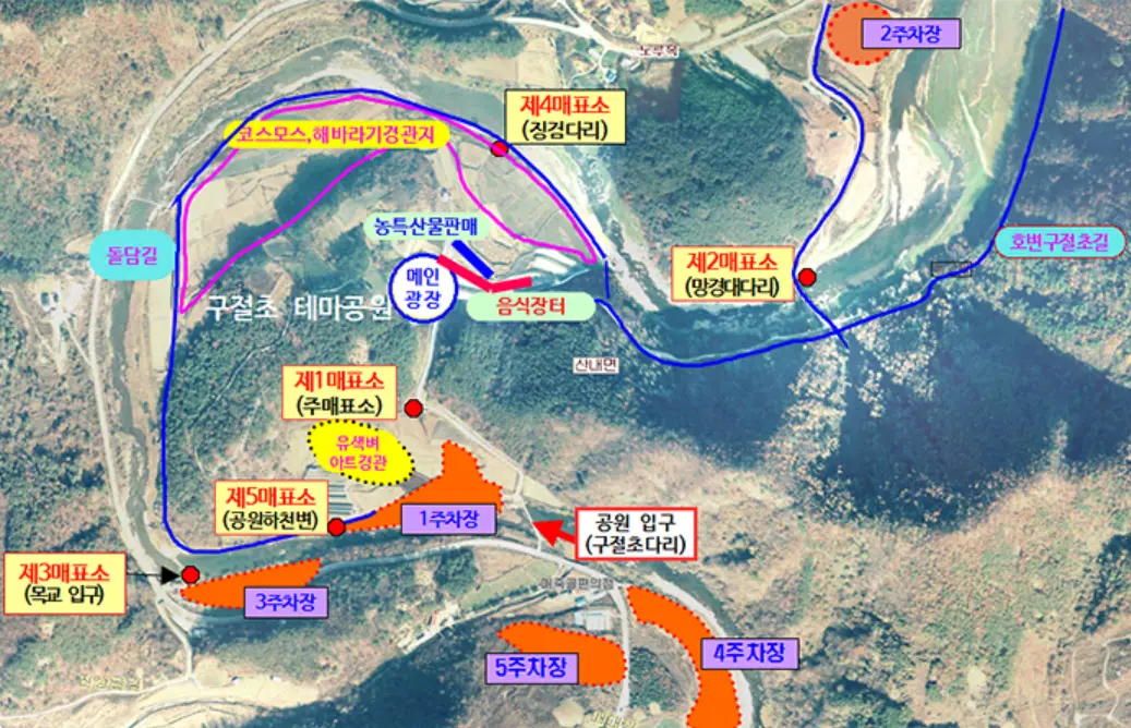 자가용: 네비게이션에서 ‘구절초 지방정원’을 검색하세요. 주차장은 1주차장을 포함해 최대 5곳이 있으며, 1주차장이 가장 행사장과 가깝습니다.