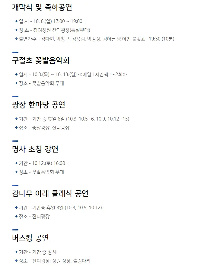 | 꽃밭음악회 | 10월 3일 ~ 13일, 매일 1~2회 공연 |