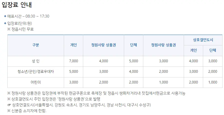 | 청소년/군인/경로우대 | 5,000원 (정원사랑상품권: 3,000원) |