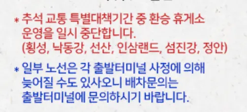 2024년 추석 연휴 동안 환승 휴게소(횡성, 낙동강, 선산 등)가 일시 중단되며, 공동협정 차량이나 전세버스가 추가로 투입될 예정입니다. 따라서 긴 이동 시간을 계획하고 여유롭게 준비하는 것이 중요합니다.