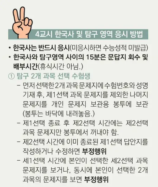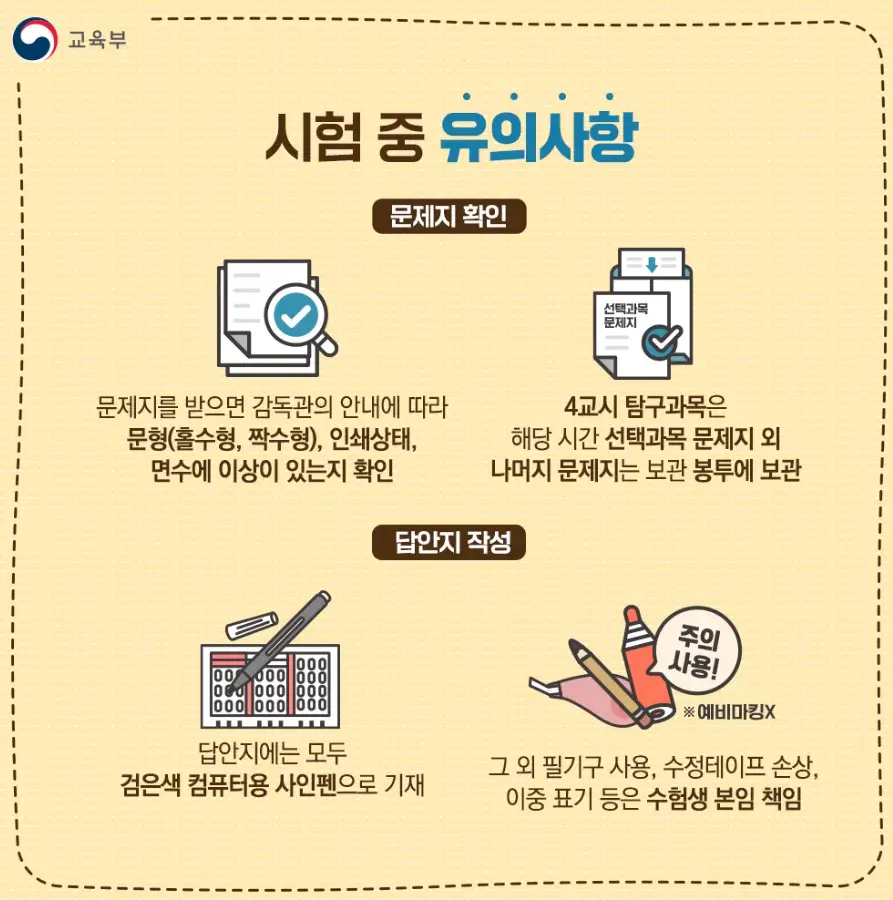탐구 과목의 문제지만 책상 위에 두고 풀어야 하며, 선택 과목의 순서를 바꿔 푸는 행위는 부정행위로 간주됩니다.