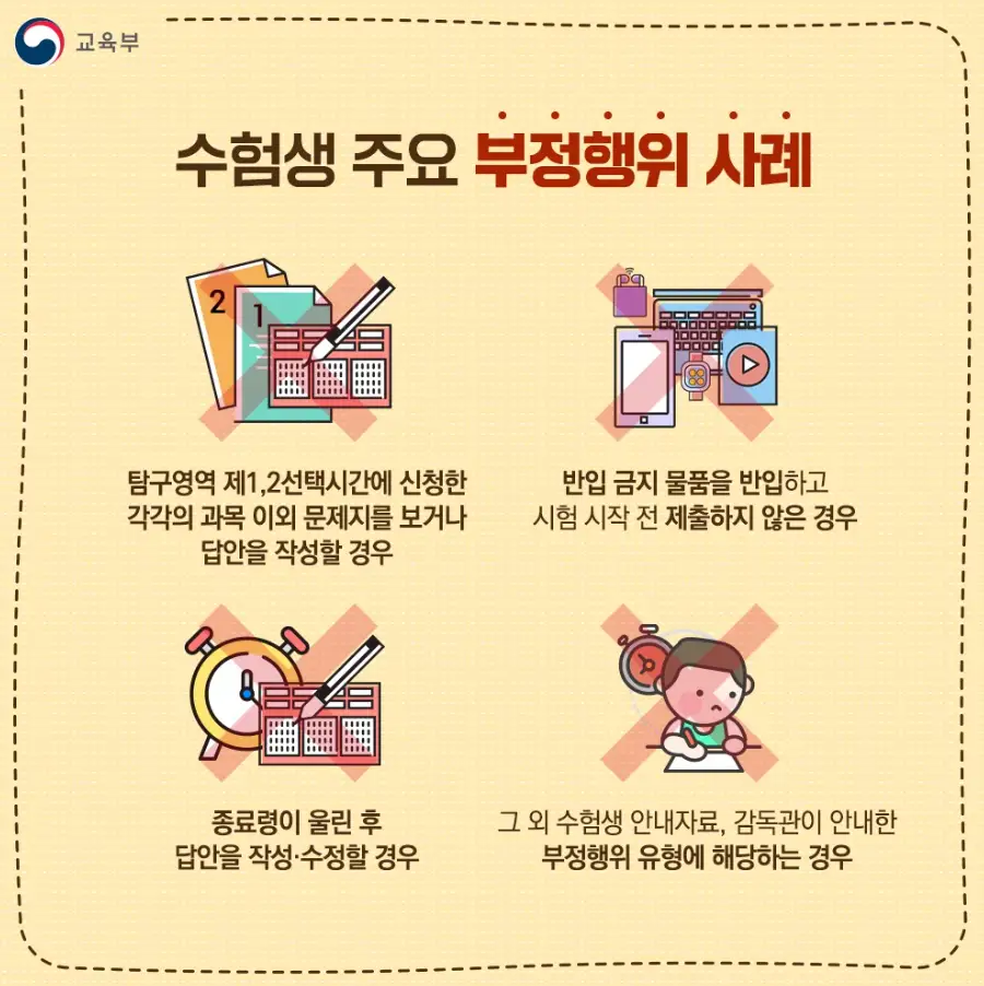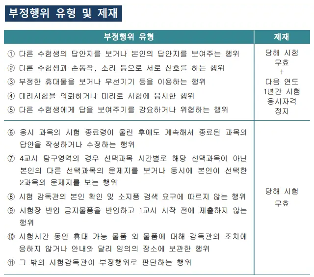 시험 종료령이 울린 후에도 답안지를 작성하거나, 반입 금지 물품을 소지하거나 사용하는 경우 부정행위로 처리됩니다. 특히 탐구 영역의 경우 본인이 선택한 과목 외의 문제지를 올려놓거나 문제지를 동시에 올려두어도 부정행위로 간주됩니다.
