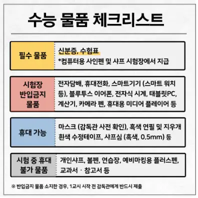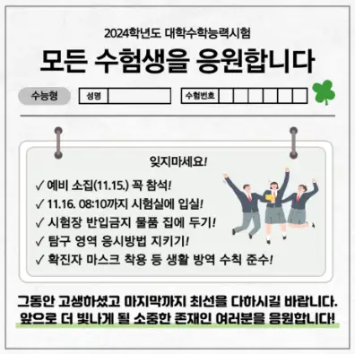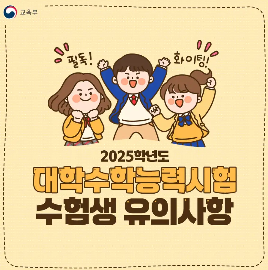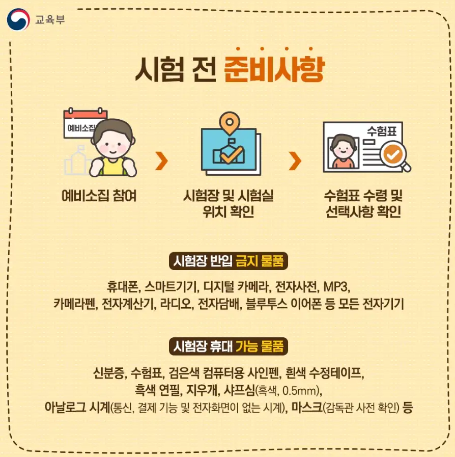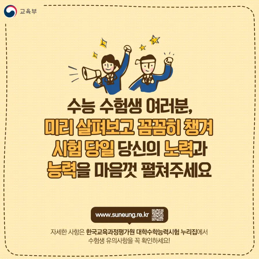 이상으로 수능 응시 전 필수적으로 확인해야 할 내용을 정리하였습니다. 모든 수험생이 최선을 다할 수 있도록 준비와 유의사항을 잘 숙지하시기 바랍니다. 힘내세요!