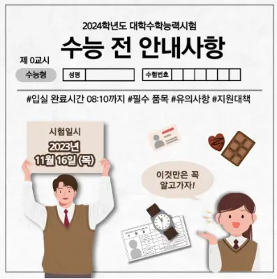수능시험은 수험생들에게 매우 중요한 시험으로, 사전에 철저히 준비하고 유의사항을 잘 숙지해야 합니다.